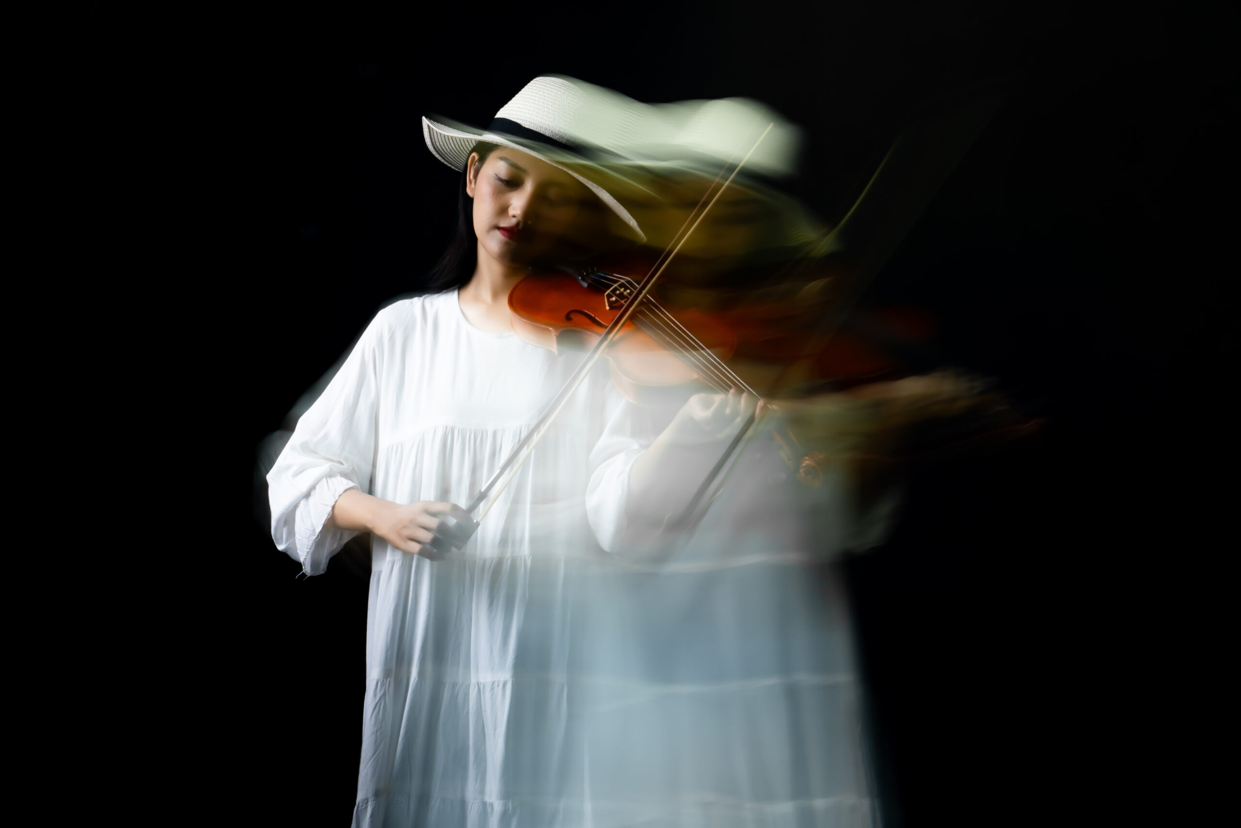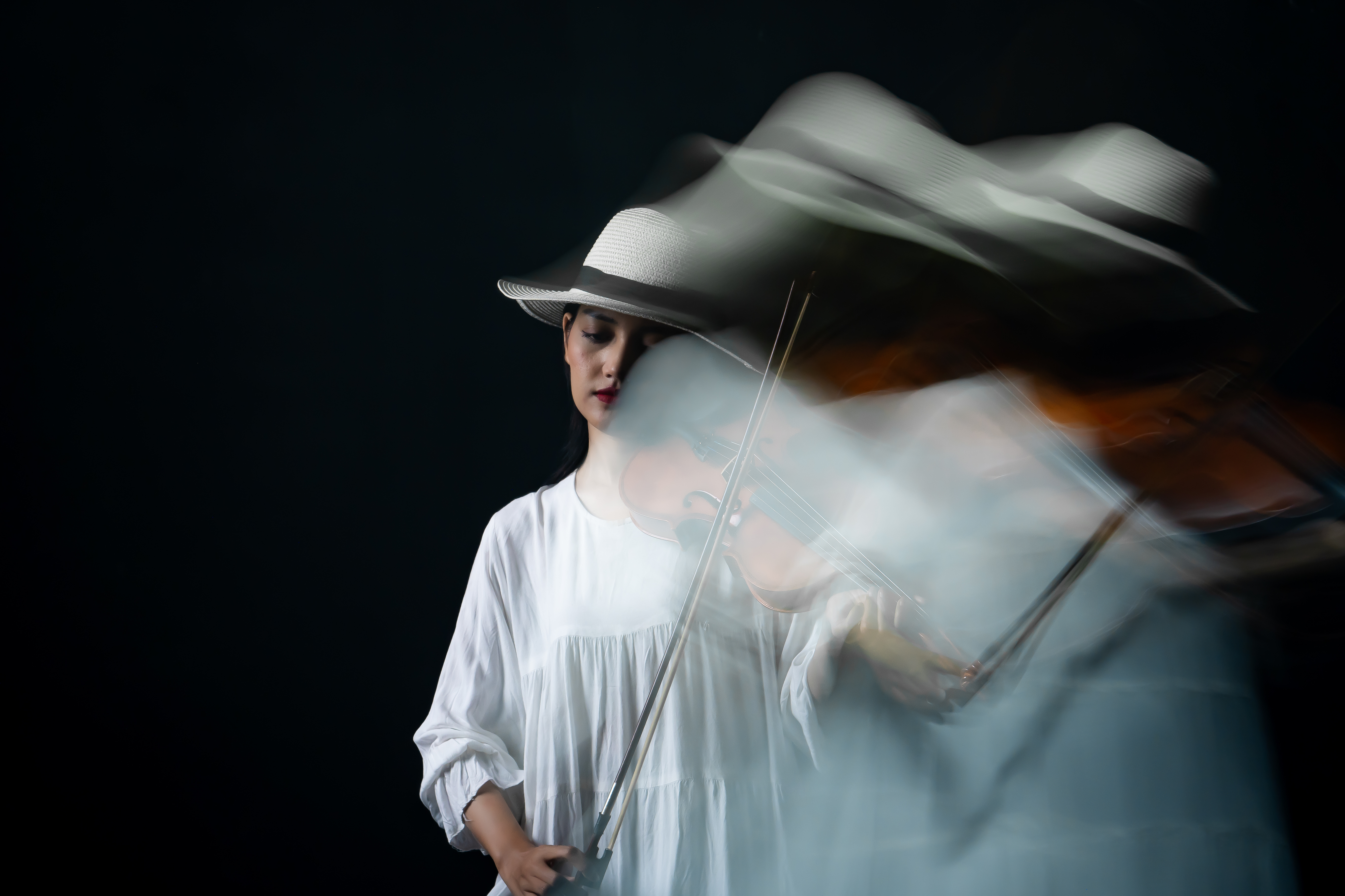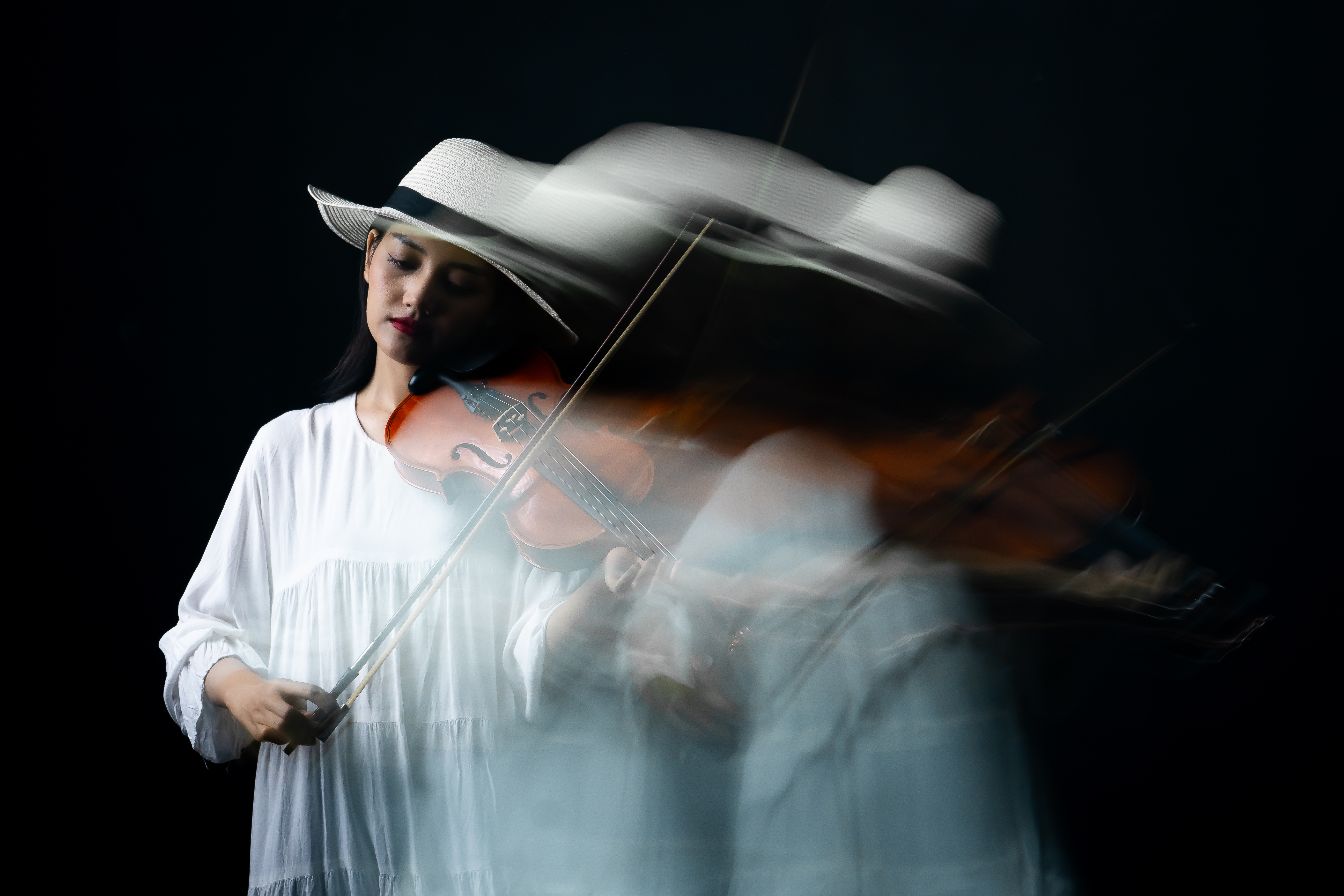 Each frame captures not the sound of the violin, but its echo suspended between moments, where rhythm becomes blur and melody turns to light.