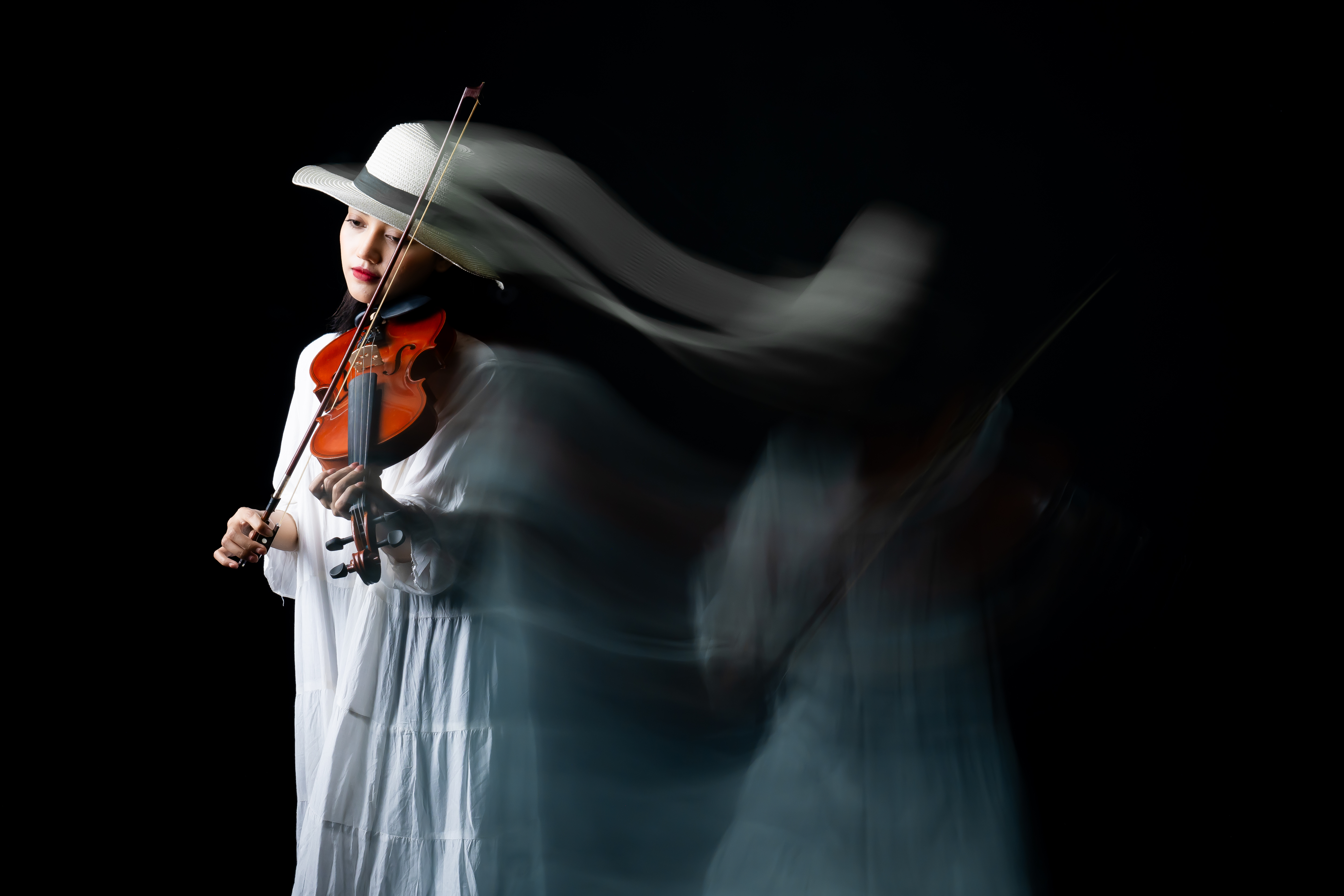Her white dress drifts like a breath between worlds, and the movement of her hand paints invisible notes in the air. There is a haunting softness here, a quiet devotion a reminder that art lives not only in perfection, but in the tremble of its pursuit.