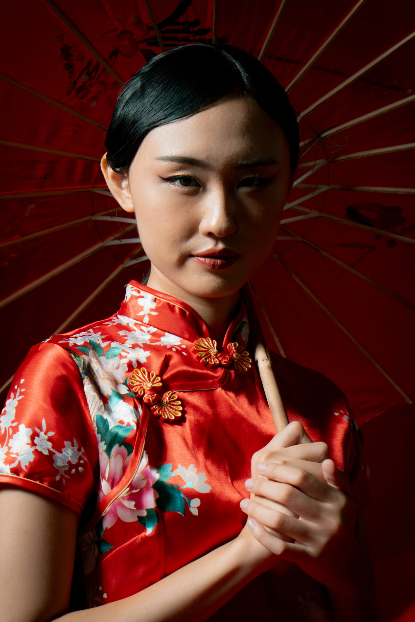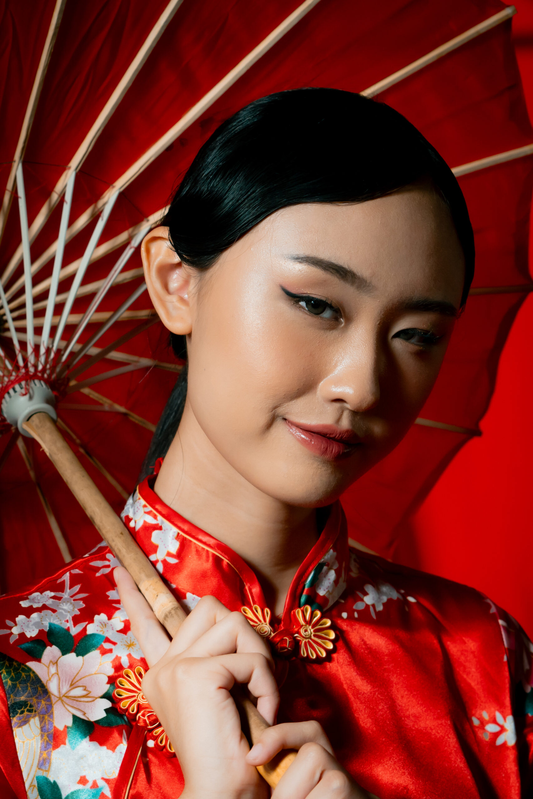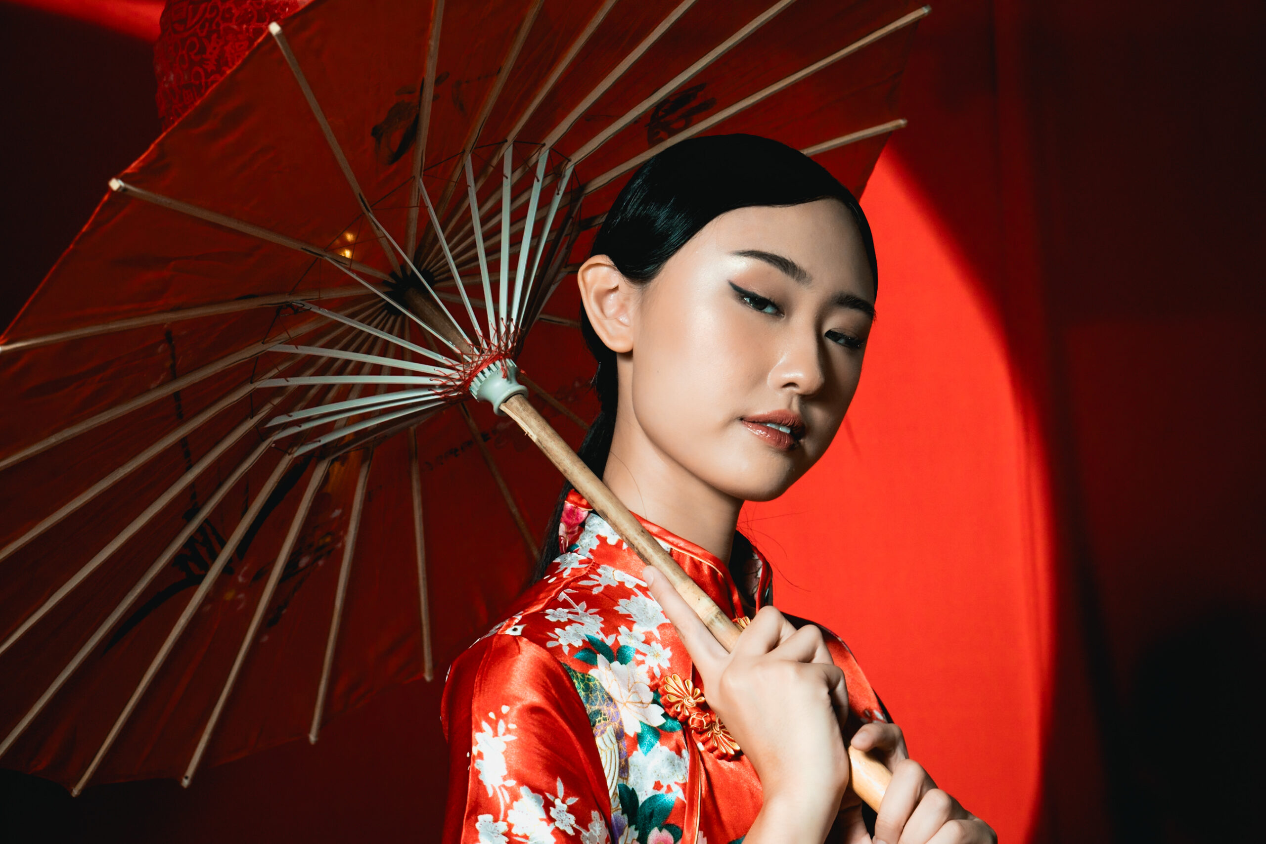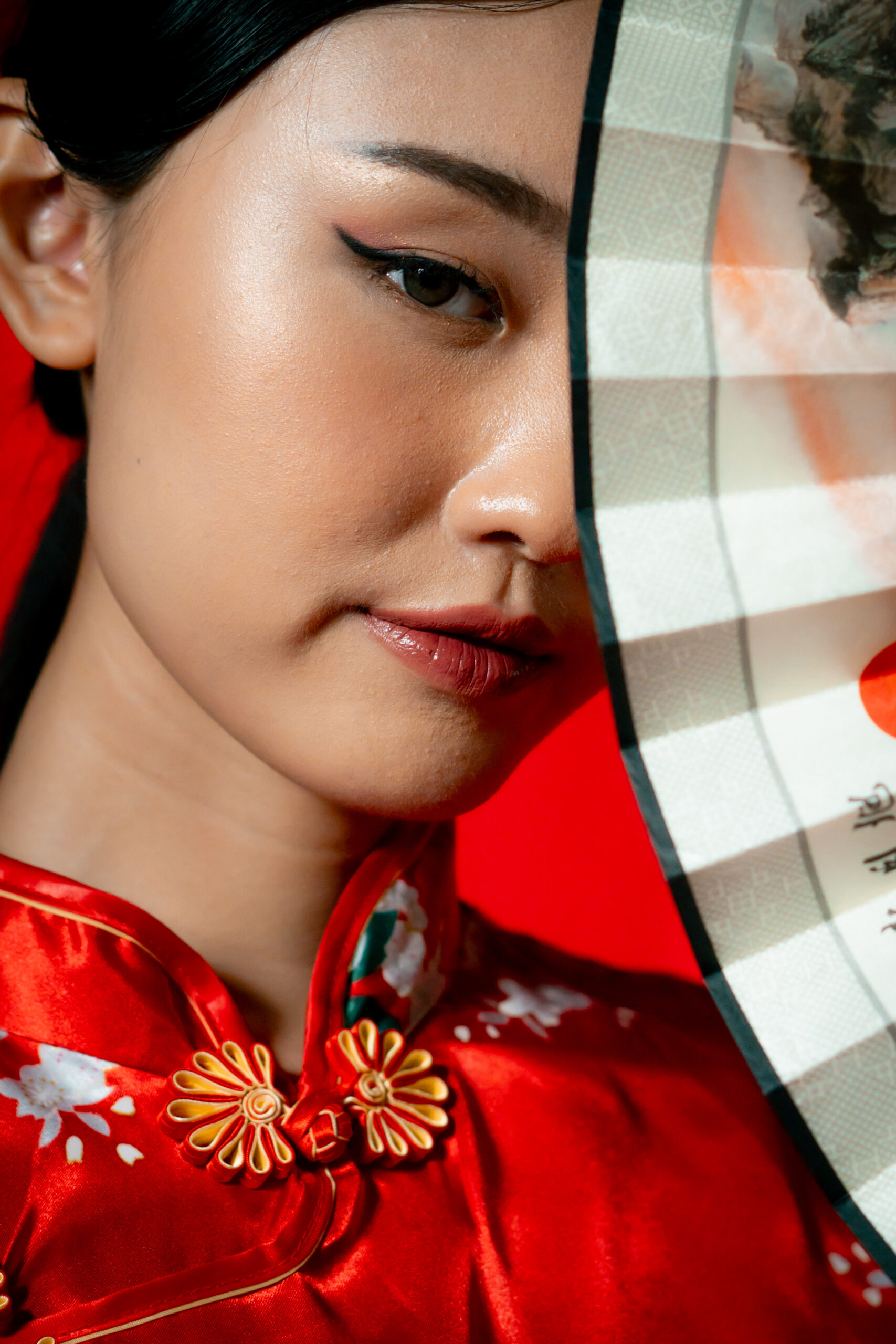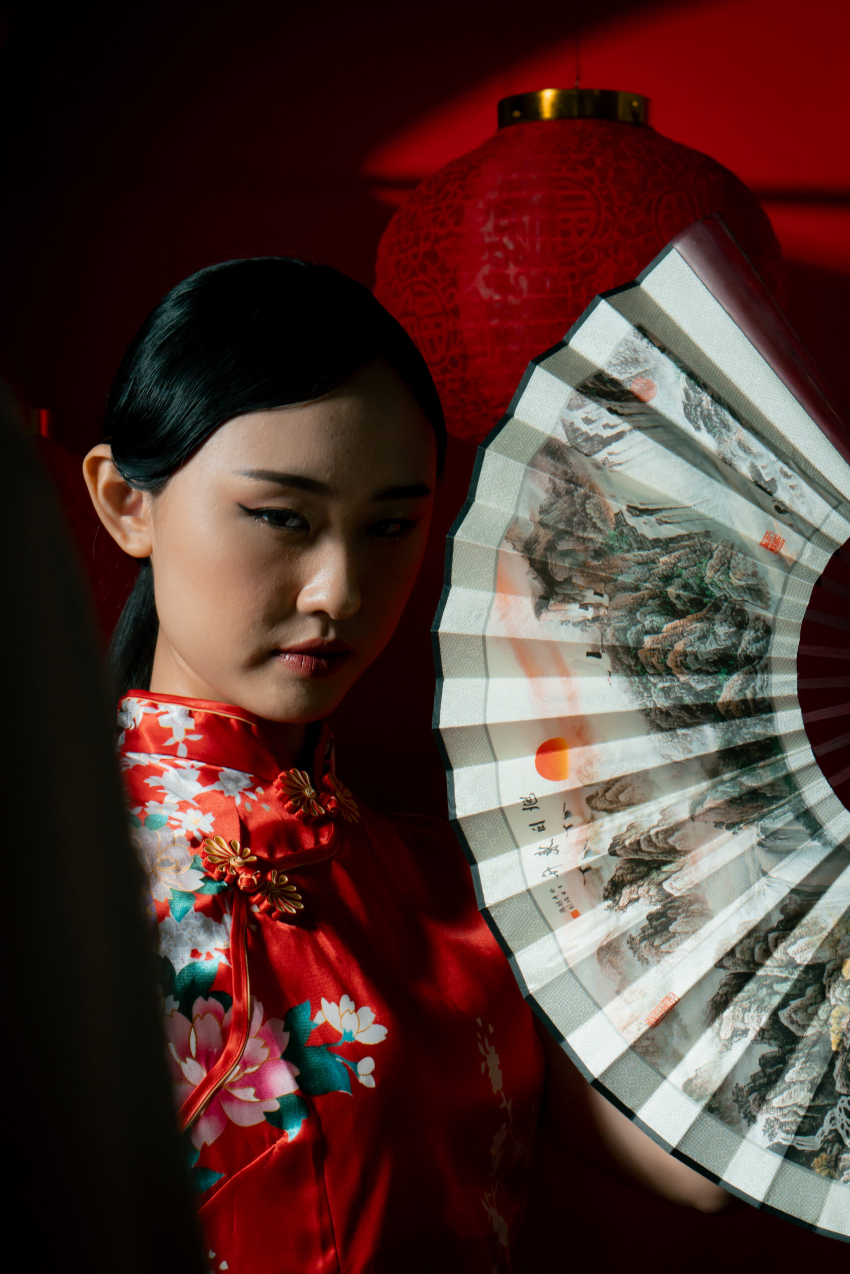 Beneath the glow of scarlet, she stands serene, graceful, unshaken. The soft silk of her cheongsam catches the light like a whispered memory, while her fan and parasol speak of traditions that have traveled through generations.