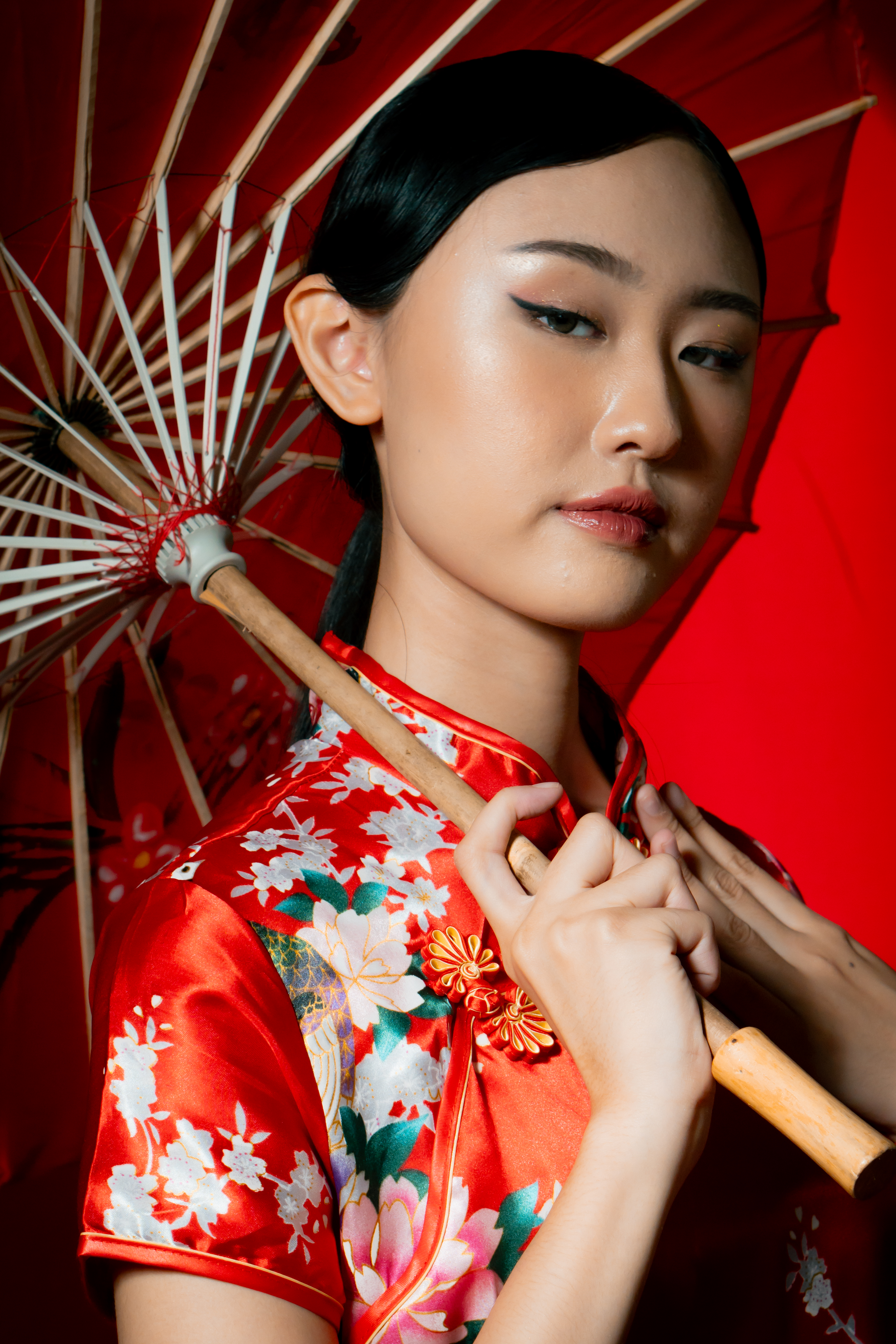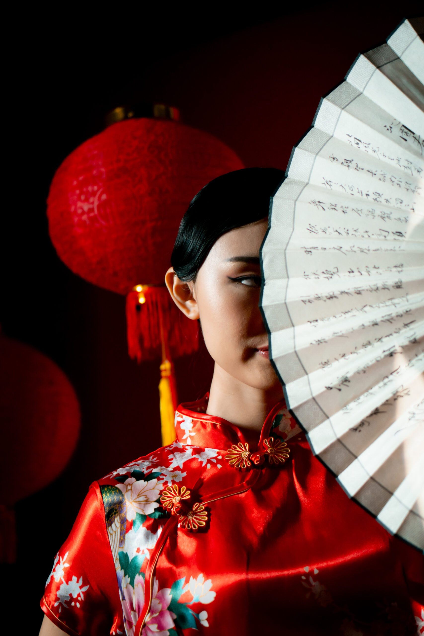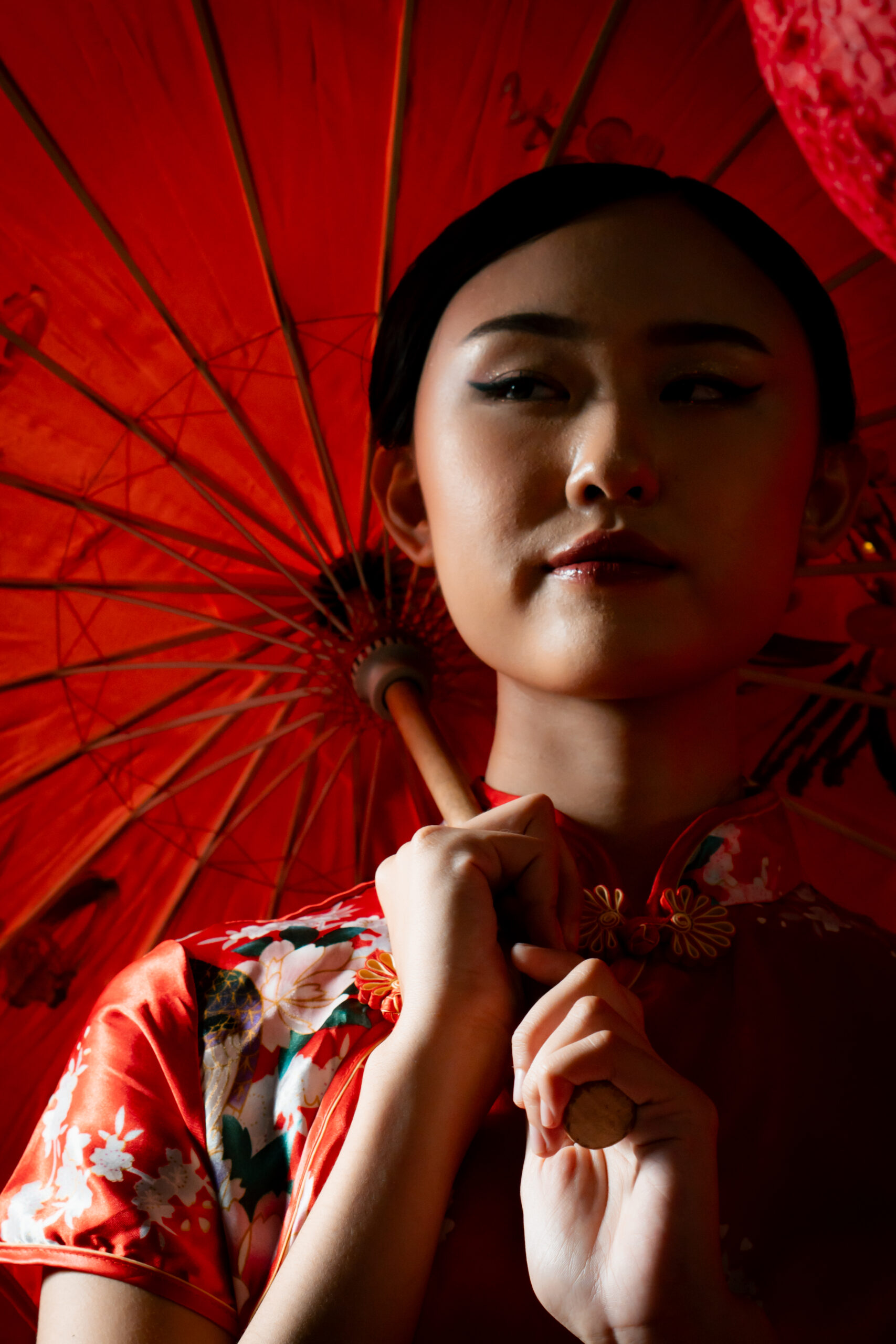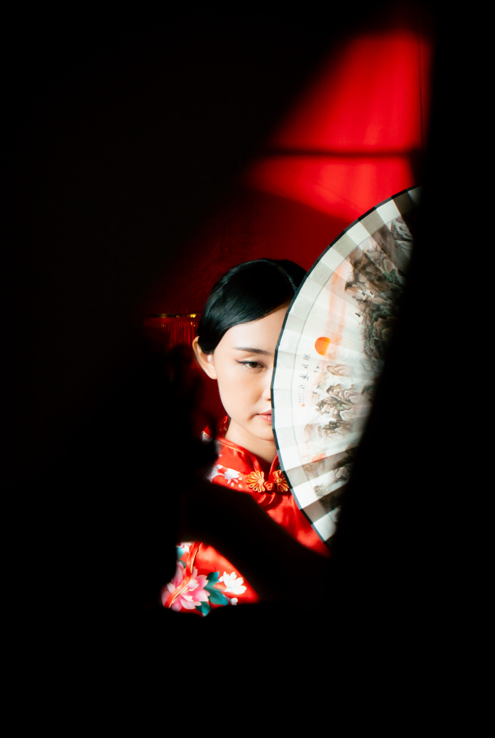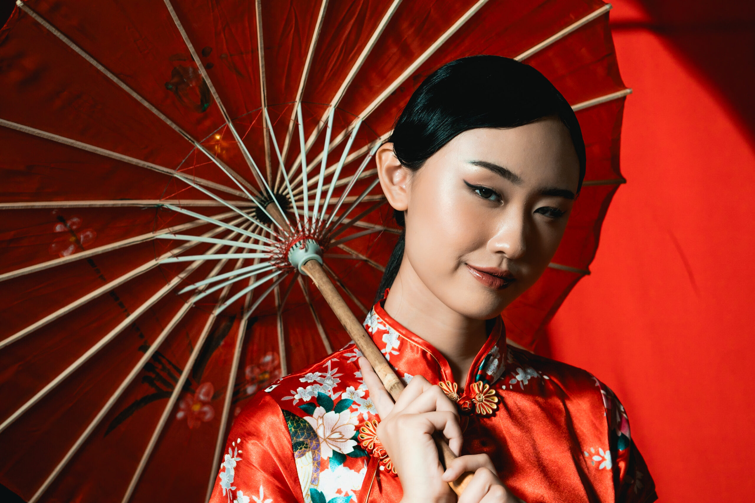 Beneath the glow of scarlet, she stands serene, graceful, unshaken. The soft silk of her cheongsam catches the light like a whispered memory, while her fan and parasol speak of traditions that have traveled through generations.