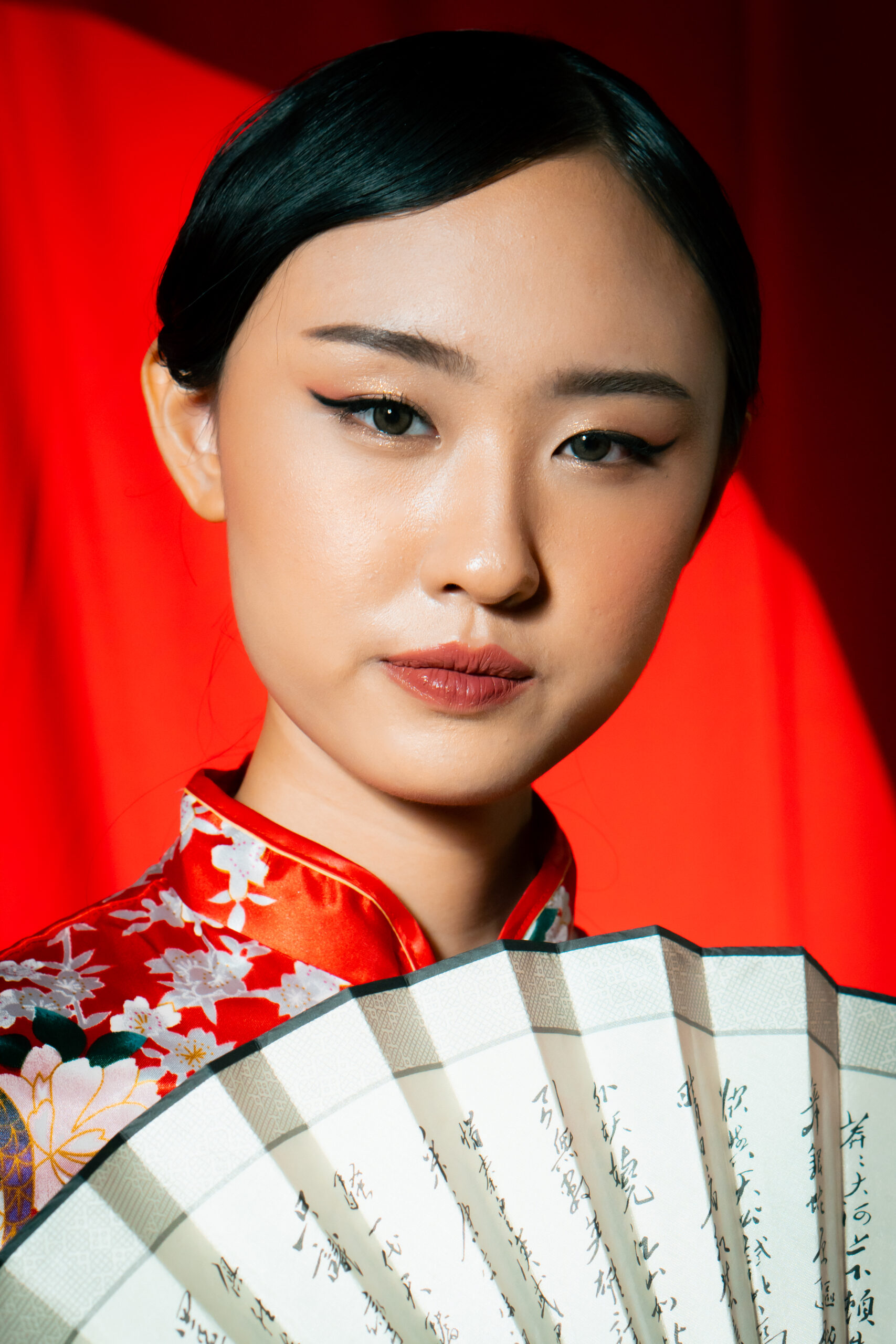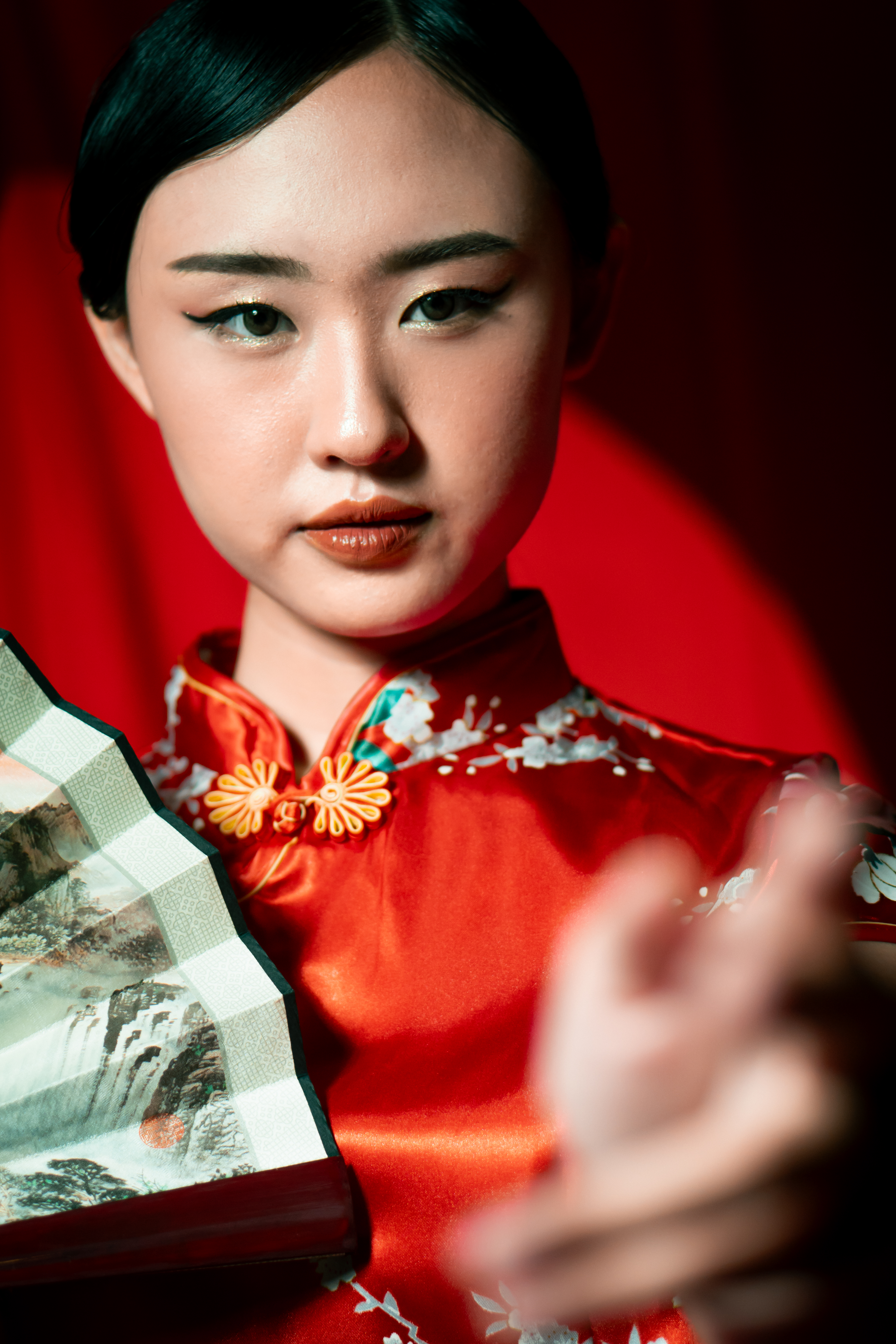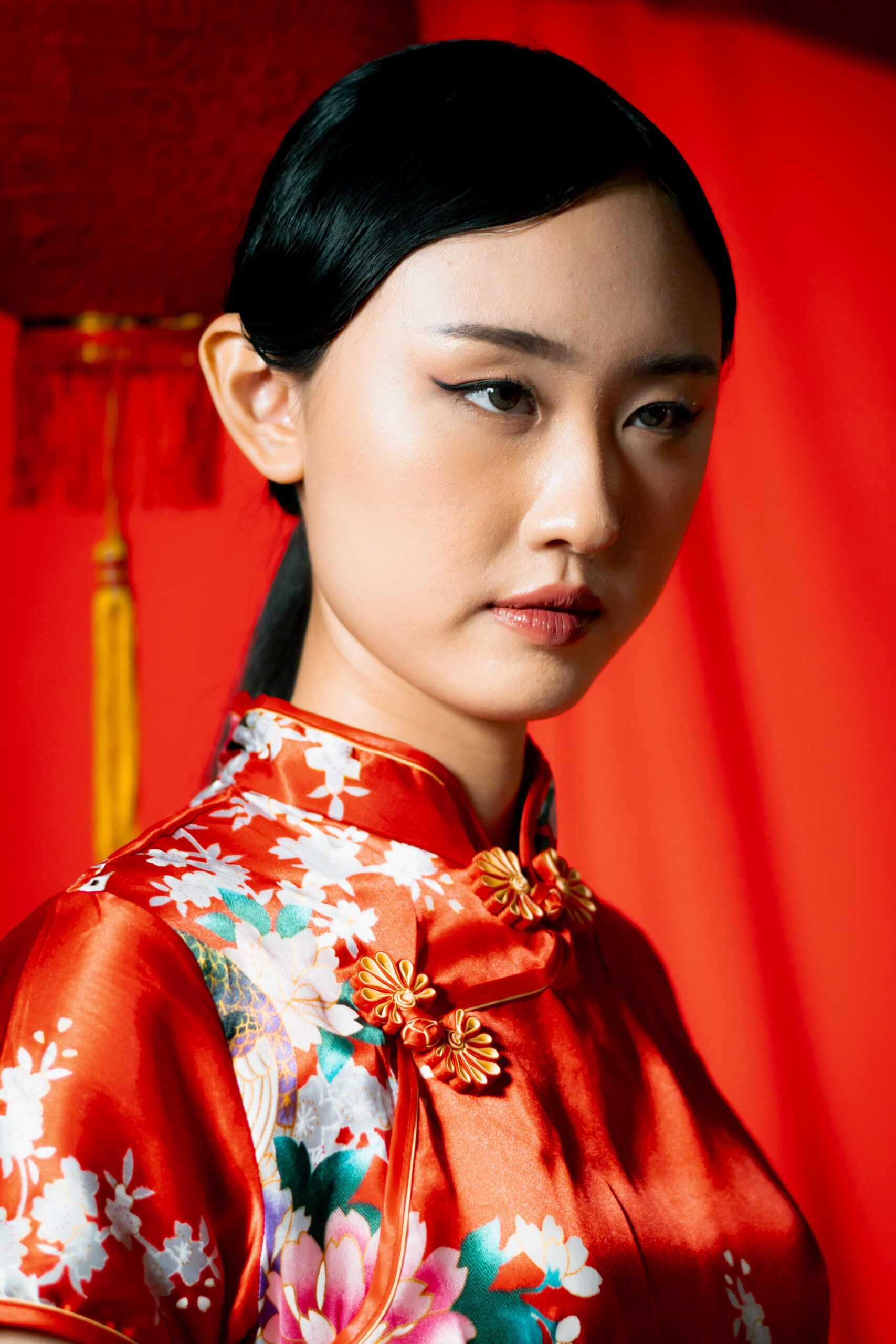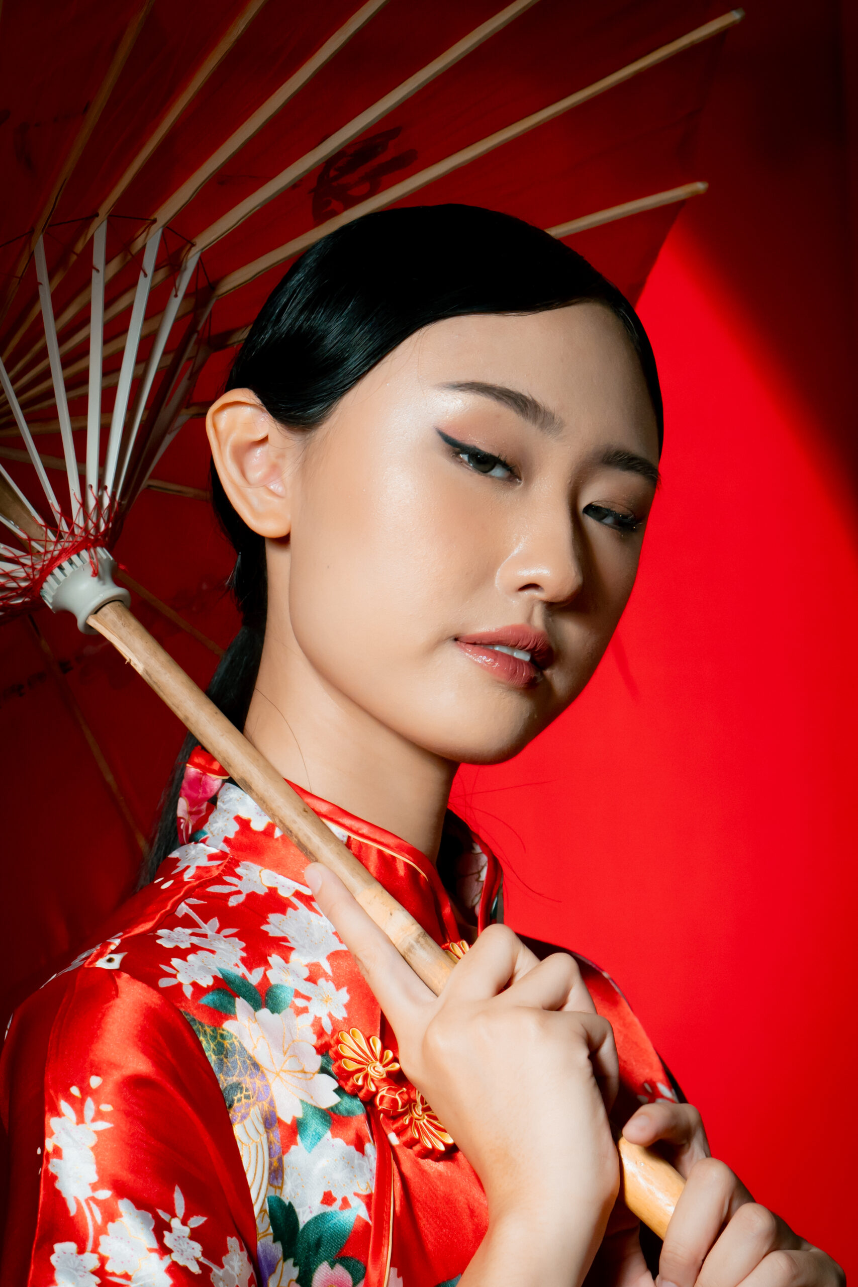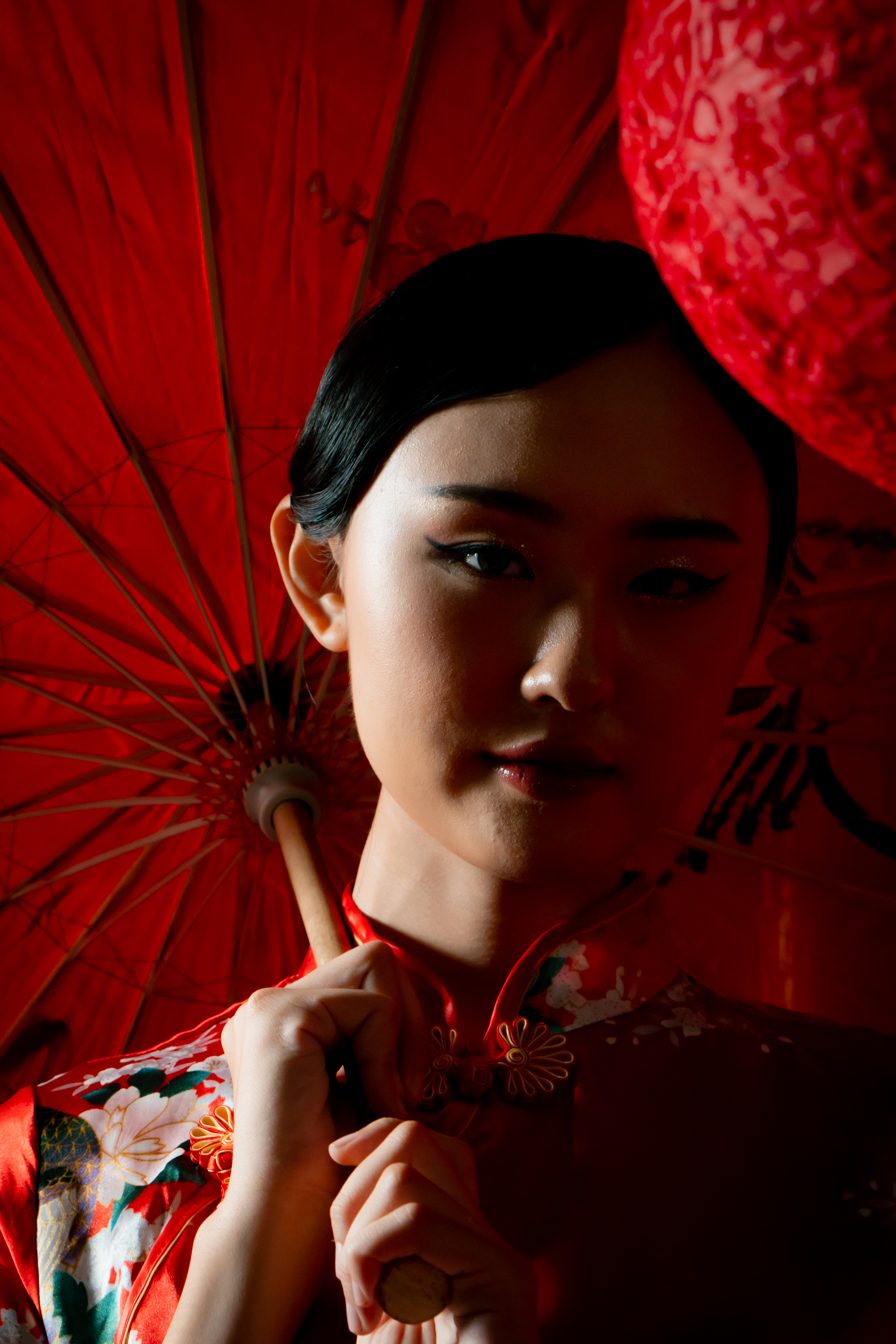 Beneath the glow of scarlet, she stands serene, graceful, unshaken. The soft silk of her cheongsam catches the light like a whispered memory, while her fan and parasol speak of traditions that have traveled through generations.